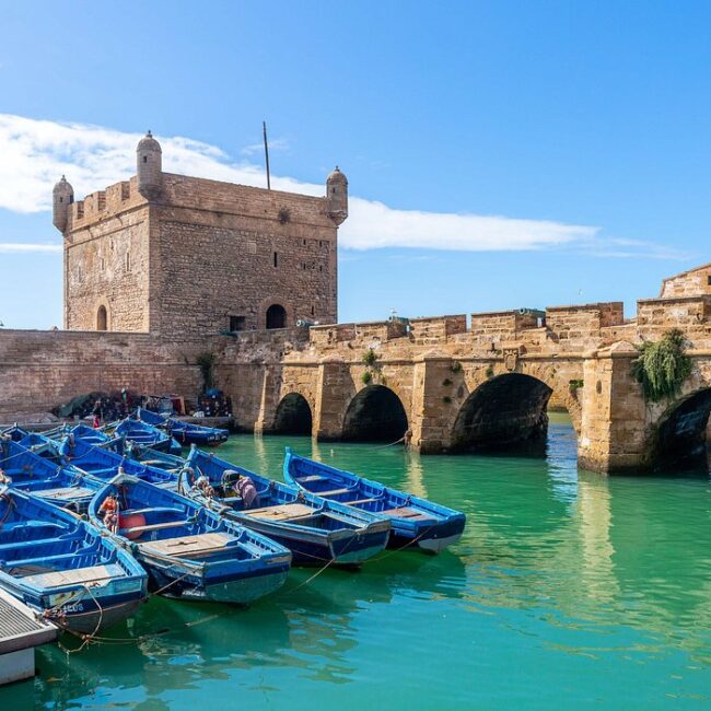 Desayuno. Salida temprano hacia Essaouira. Visita de la ciudad cargada de la historia portuguesa con el primer puerto de la ciudad, fortificado, que todavía existe. Por la tarde, salida hacia Casablanca pasando por la carretera del Atlántico, con paradas en Oualidia y El Jadida. Visita de orientación de El Jadida (construida por los portugueses y anteriormente conocida como Mazagan "Mazagão") con la posibilidad de visitar la Cisterna portuguesa. Llegada a Casablanca. Cena y alojamiento.